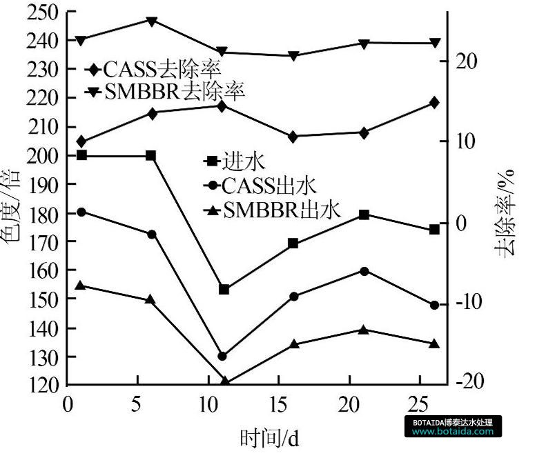 圖5 CASS和SMBBR工藝對色度的去除效果