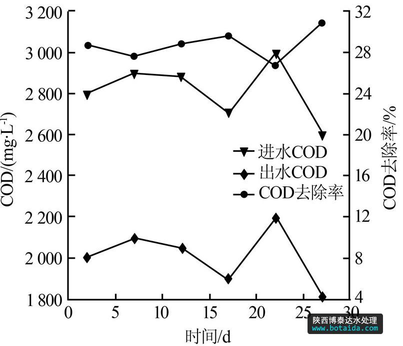 由圖 3可以看出,水解酸化工藝對COD的去除率基本穩(wěn)定在20 %左右,與文獻〔6〕報道的10%~20%比較接近,出水COD約為2 800 mg/L。