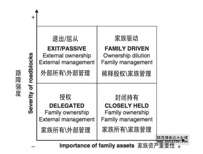家族企業(yè)路線圖為家族可以選擇的路線提供了一個(gè)非常簡(jiǎn)明的圖解。通常,它能做出如下預(yù)測(cè):家族資產(chǎn)漸趨減少的企業(yè)應(yīng)該更多地尋求外部管理的介入,而目前以及未來(lái)面臨重大障礙的企業(yè),則應(yīng)該積極尋求所有權(quán)結(jié)構(gòu)的改革,以便將障礙可能造成的損失減小到最低。