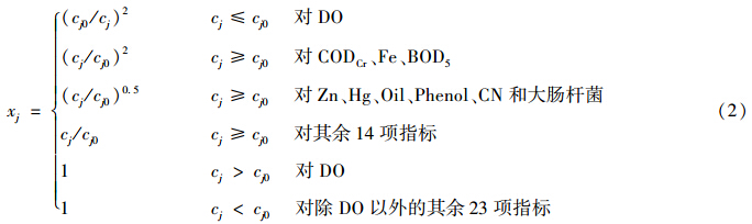 式中,x′j 為指標j的規(guī)范值;xj為指標j的變換值,對4類水體和空氣指標j設定的變換式分別如式(2)~式(7)所示.