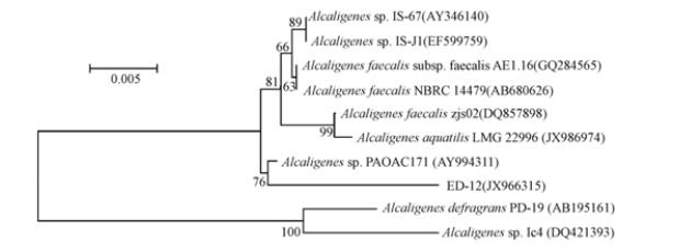 經(jīng)測(cè)序,獲得片段長(zhǎng)度為1463 bp的部分16S rRNA基因序列,GenBank登錄號(hào)為JX966315. 在NCBI數(shù)據(jù)庫(kù)的比對(duì)結(jié)果表明,該菌株與Alicaligenes sp.的相似性達(dá)98%以上,推測(cè)其為Alicaligenes sp. 選擇序列相關(guān)性較高的76個(gè)16S rRNA序列,用Cluxtal X序列分析軟件分析其與ED-12的序列同源可靠性,選9個(gè)可信度較高的序列用MEGA 4.0軟件通過(guò)N-J法構(gòu)建系統(tǒng)發(fā)育樹(shù),確定ED-12的進(jìn)化地位,結(jié)果如圖 1所示.