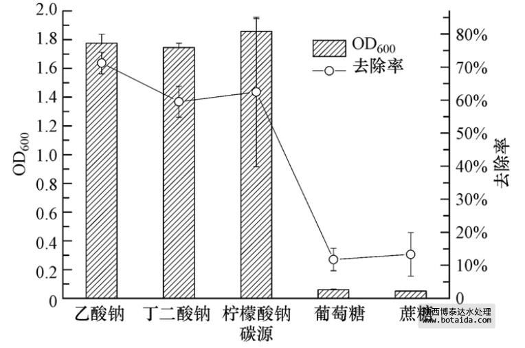 以乙酸鈉、丁二酸鈉、檸檬酸鈉、葡萄糖和蔗糖為碳源,菌株ED-12的生長(zhǎng)及除磷能力結(jié)果如圖 3所示,菌株ED-12在以葡萄糖和蔗糖為碳源時(shí)基本不生長(zhǎng),對(duì)PO3-4-P的去除率低于15%. 而菌株在以乙酸鈉、丁二酸鈉、檸檬酸鈉為碳源時(shí)長(zhǎng)勢(shì)較好,且對(duì)PO3-4-P的去除率都在50%以上. 其中,以乙酸鈉為碳源時(shí),菌株ED-12生長(zhǎng)最旺盛,對(duì)PO3-4-P的去除率達(dá)到了70%以上. 對(duì)比5種碳源結(jié)構(gòu)與分子量,相對(duì)而言,在分子結(jié)構(gòu)簡(jiǎn)單、分子量低的情況下,聚磷菌的生長(zhǎng)較好,且能達(dá)到一個(gè)較高的除磷率,這與前述觀點(diǎn)相符. 此外,聚磷菌對(duì)不同碳源的利用效果可能還與其本身對(duì)碳源的親和性或其他特性有關(guān).