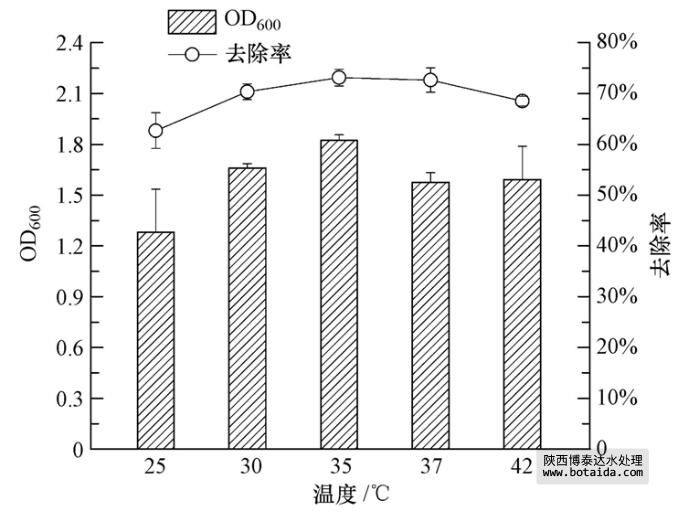 圖 7 不同溫度對(duì)菌株ED-12生長(zhǎng)及除磷能力的影響