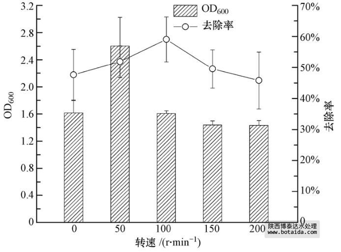 如圖 8所示,搖床轉(zhuǎn)速在0~200 r · min-1之間,菌株ED-12都能生長(zhǎng). 當(dāng)搖床轉(zhuǎn)速為50 r · min-1時(shí),菌體OD600最高,達(dá)2.60±0.62;當(dāng)搖床轉(zhuǎn)速為100 r · min-1時(shí),對(duì)PO3-4-P的去除率最高,達(dá)59.05%±7.26%. 在各培養(yǎng)條件下,菌體的生長(zhǎng)與除磷率趨勢(shì)不盡相同,說(shuō)明二者是彼此獨(dú)立的過(guò)程.靜置培養(yǎng)時(shí),儲(chǔ)存于異染顆粒的磷被分解,用于菌體的生長(zhǎng),此時(shí)對(duì)PO3-4-P的去除率近50%,說(shuō)明菌株ED-12在厭氧條件下還能將環(huán)境中的磷用于生長(zhǎng). 好氧條件下,菌體將部分磷用于生長(zhǎng),并將剩余的磷儲(chǔ)存于異染顆粒中,因此,在轉(zhuǎn)速≥50 r · min-1時(shí)也能維持一個(gè)較高的除磷率. 觀察發(fā)現(xiàn),搖床轉(zhuǎn)速過(guò)高未必能提高除磷率.