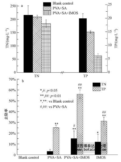 根據(jù)賴子尼等(2008)的實(shí)驗(yàn)配方制備的固定化聚磷微生物小球的彈性與機(jī)械強(qiáng)度較好,對(duì)含氮磷廢水的凈化效果表明,菌球?qū)α子休^強(qiáng)的去除能力(從(19.91±1.81)mg · L-1 降至(6.19±0.76)mg · L-1),同時(shí)能夠去除一定的氮(從(215.82±35.29)mg · L-1 降至(183.42±15.35)mg · L-1)(圖 10 a). 二者的去除率分別達(dá)56.21%和15.01%(圖 10 b). 其中,固定化材料對(duì)氮的吸附比例較小,而對(duì)磷的吸附較顯著(p<0.01),這可能與固定化材料的表面官能團(tuán)及CaCl2等對(duì)PO3-4的親和力強(qiáng)于NO-3有關(guān). 同時(shí),固定化微生物(IMOs)對(duì)磷的去除效果也優(yōu)于氮,說(shuō)明菌株ED-12可能不具備反硝化能力,對(duì)氮的利用僅是生長(zhǎng)所需. 由PVA+SA+IMOs組與PVA+SA組比較可知(圖 10b,#表示),無(wú)論是氮還是磷,都存在顯著差異,說(shuō)明固定化微生物是氮磷去除的主要貢獻(xiàn)者.