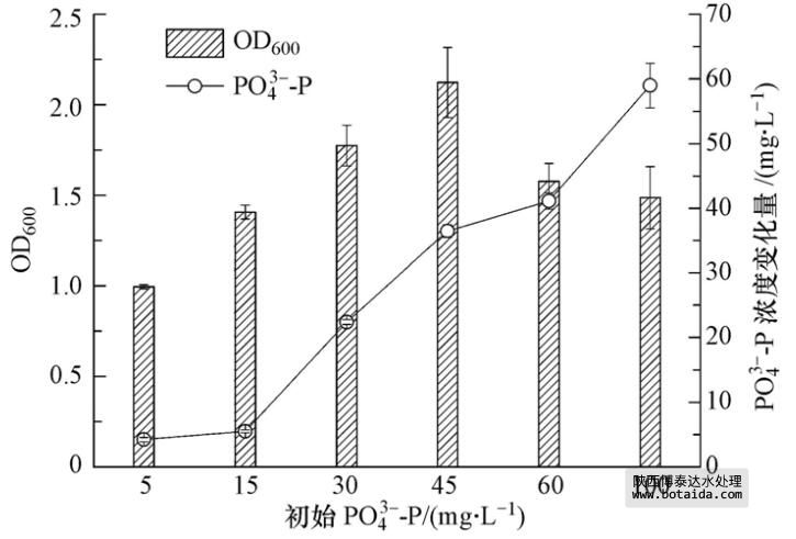 聚磷菌對(duì)磷的去除包括兩條途徑:生長(zhǎng)利用和異染顆粒貯磷.根據(jù)聚磷菌分離篩選原理,過(guò)高濃度的PO3-4-P會(huì)抑制聚磷菌的生長(zhǎng)與繁殖. 因此,考察不同起始濃度的PO3-4-P對(duì)聚磷菌生長(zhǎng)的影響及相應(yīng)條件下聚磷菌對(duì)PO3-4-P的去除效果,對(duì)分析聚磷菌生長(zhǎng)與聚磷過(guò)程的關(guān)系及指導(dǎo)聚磷菌在富營(yíng)養(yǎng)化水體中的工程應(yīng)用有實(shí)際意義.