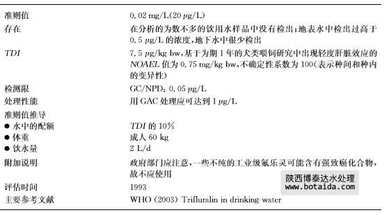 氟樂(lè)靈(CASNo.1582 09 8)是一種用于多種農(nóng)作物的芽前除草劑。它水溶性低,與 土壤有很高的親和力。然而,生物降解和光降解過(guò)程可能生成能污染飲用水源的極性代謝 物。盡管氟樂(lè)靈在許多國(guó)家都有使用,但關(guān)于飲用水污染的數(shù)據(jù)相當(dāng)有限。