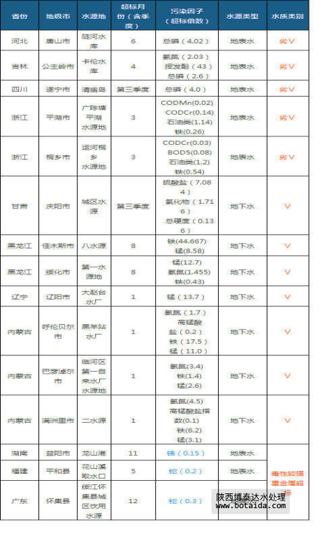 地表水水源地數(shù)量為995個,地下水水源地數(shù)量為338個,雖然地下水水源地數(shù)量只有地表水水源地數(shù)量的1/3,但其超標(biāo)比例卻是后者的3.2倍。平均每個地下水水源地超標(biāo)6.3次。