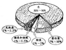 水在細胞中含量是最多的.在不同種類的生物體中,水的含量差別較大,一般來說,生物體中水的含量為60%~95%.例如,幼嫩植物體中水的含量約為70%,動物體中水的含量約為80%左右,水母的身體里水的含量竟約為97%.