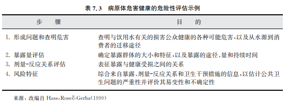 風(fēng)險評估、包括QMRA,首先從提出問題開始,其目的是確定各種可能的危害及危 害從源頭到消費(fèi)者的各種遷移路徑。然后,將人接觸病原體的情況(環(huán)境濃度及攝入 量)和所選(或參考)生物體的劑量 反應(yīng)關(guān)系綜合起來以描繪出風(fēng)險的特征。結(jié)合其他 信息(社會、文化、政治、經(jīng)濟(jì)、環(huán)境等)就可提出一些優(yōu)先選用的管理辦法。為鼓勵利 益相關(guān)各方的支持和參與,在處理過程的每一階段,都能做到透明并主動溝通有關(guān)危險 性的信息是非常重要的。表7.3給出了危險性評估的一個例子并在下面進(jìn)行詳細(xì) 描述。