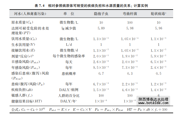 當(dāng)需將一個病例中發(fā)生特定疾病的風(fēng)險轉(zhuǎn)化為疾病負(fù)擔(dān)時,可以使用DALY(metric disabilityadjustedlifeyear)(見第3章3.1)。這不但反映了急性終點(diǎn)反應(yīng)(腹瀉),也反映了 死亡率和更嚴(yán)重的終點(diǎn)反應(yīng)(如與彎曲桿菌有關(guān)的格林 巴利綜合癥,即急性感染性多發(fā)神 經(jīng)炎)。每個病例的疾病負(fù)擔(dān)變化很大。例如,每1000例輪狀病毒的疾病負(fù)擔(dān)在低收入地 區(qū)為480DALYs,而且還經(jīng)常發(fā)生兒童死亡。但在大多數(shù)居民都能得到醫(yī)療救助的高收入 地區(qū)僅為14DALYs/1000例(見附錄1支持性文件《世界衛(wèi)生組織飲用水水質(zhì)準(zhǔn)則中公共 衛(wèi)生風(fēng)險量化》)。由于這種疾病負(fù)擔(dān)上的明顯差別,為了要達(dá)到相同的危險程度(以 DALYs/人/年表示),在相同水源質(zhì)量的情況下,在低收入地區(qū)就需要實(shí)施更嚴(yán)格的水處 理。表7.4中10-6DALY/人/年這樣的健康結(jié)果目標(biāo)最好能與具體國情相結(jié)合。表7.4中 沒有免疫缺陷人群的計算數(shù)值(如 HIV/AIDS患者中的隱孢子蟲?。?,在某些國家,這些人群的數(shù)量還是很多的。3.2節(jié)中有更多關(guān)于DALY的信息,及關(guān)于如何將其用于獲取風(fēng)險 參考值。