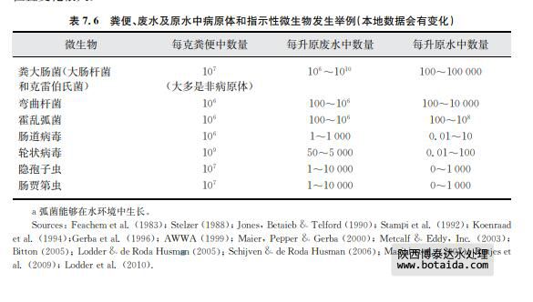 表7.6中,可以清楚地看到糞便指示菌,如大腸桿菌在廢水中常常呈現(xiàn)較高濃度。每個 人都會散布大腸桿菌,但濃度變化很大。只有被感染的人散布病原體,因此,廢水中病原體 濃度變化更大。這樣的變化取決于擴散模式,也依賴于其他因素,如排放廢水的人群規(guī)?;?被其他廢水、如工業(yè)廢水稀釋的規(guī)模。傳統(tǒng)廢水處理在廢水被排放到地表水之前,常常降低 一到兩個數(shù)量級的微生物濃度。在其他地方,原水被直接排放,或者通過排水管溢流偶爾排 放。排放廢水被受納水體稀釋,從而減少了病原體數(shù)量,稀釋因子是因地而異。病原體失 活、死亡或進入到沉積物里也會使病原體減少。這些因子隨著表面水體和氣候的不同而變 化。這種變化說明糞便指示菌和病原體的濃度在地表水體比廢水中變化更多。