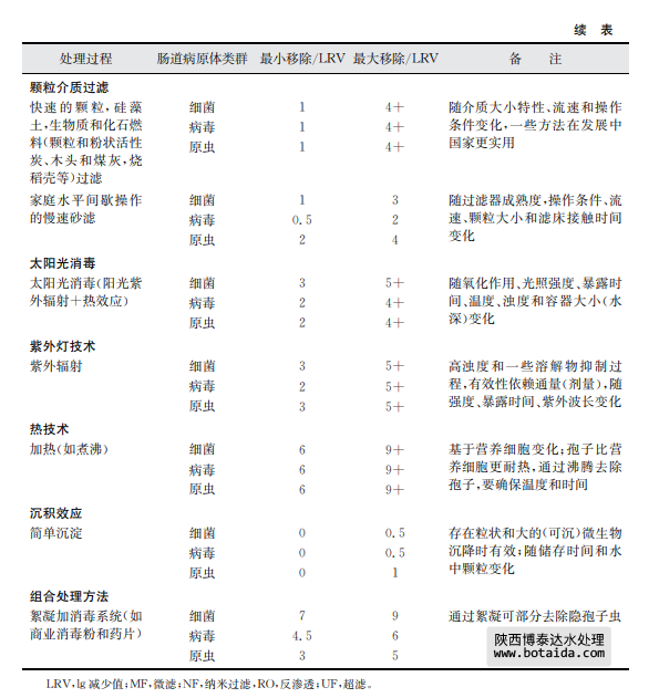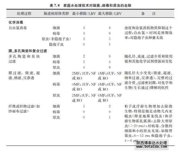 表7.8總結(jié)了采用上述幾種家庭水處理技術(shù)對水傳播細(xì)菌、病毒和寄生性原生蟲的 去除情況。這些去除信息是基于科學(xué)文獻(xiàn)報(bào)告的研究結(jié)果。有兩個(gè)有效性內(nèi)容:基本去 除和最大去除?;救コ侵赣上鄬Σ皇炀毴藛T實(shí)際操作時(shí)的一般運(yùn)行效果,且操作人 員將以上方法用于處理平均水質(zhì)或可變水質(zhì)原水及現(xiàn)場只有很少應(yīng)用工具以優(yōu)化處理?xiàng)l 件和操作時(shí)。最大去除是指在熟練操作和優(yōu)化運(yùn)行條件下,并且在可預(yù)見和不變水質(zhì)條 件下,有相關(guān)儀器工具支持并保持最高水平運(yùn)行時(shí)達(dá)到的效果(如測試一個(gè)已知濃度和種 屬的微生物時(shí))。應(yīng)當(dāng)該注意的是某些水處理工藝的lg減少值存在差異,如表7.8中的 家庭水處理和表7.7中的集中處理。這種相同處理技術(shù)、不同的運(yùn)行效果差異是可以理 解的。因?yàn)榧刑幚硭盟ǔM足處理工藝所需要的質(zhì)量,而且處理過程由訓(xùn)練有素的操作人員使用,工藝經(jīng)過合理的設(shè)計(jì)并有良好的運(yùn)行控制系統(tǒng)。相反,家庭水處理通常 水質(zhì)變化較大,也沒有得到最好的運(yùn)行技術(shù)優(yōu)化。相對于管理集中處理設(shè)施的人員,處理 過程也常常得不到專業(yè)人員的專業(yè)運(yùn)行控制。這些處理過程的進(jìn)一步細(xì)節(jié),包括運(yùn)行影 響因子和表7.8中提供的lg減少值水平基礎(chǔ),可見附錄1支持性文件《家庭水管理和家庭 水處理選擇評估》。陜西博泰達(dá)水處理為您提供服務(wù)。
