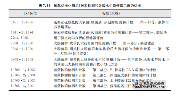 國際標(biāo)準(zhǔn)方法在被采納之前應(yīng)根據(jù)當(dāng)?shù)氐木唧w情況進(jìn)行評估??梢允褂靡呀⒌臉?biāo)準(zhǔn) 方法,如國際標(biāo)準(zhǔn)化組織(ISO)(見表7.11)的方法或效果及可靠性與其相當(dāng)?shù)姆椒ň刹?用。對于常規(guī)檢測可采用那些已建立的方法。無論選用何種方法檢測埃希氏大腸桿菌或耐 熱性大腸菌群,都必須考慮因環(huán)境或消毒劑受到損傷的微生物菌株的“復(fù)蘇”或“恢復(fù)”問題。