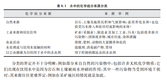 制訂每一項準(zhǔn)則值的科學(xué)依據(jù)詳見第12章。這些資料對不同國家地區(qū)依據(jù)準(zhǔn)則值制 定自己的標(biāo)準(zhǔn),或者當(dāng)污染物濃度超過準(zhǔn)則值時,評估其對健康的影響具有重要意義。 飲用水中化學(xué)污染物可以按不同方法進行分類,其中最合適的方法是根據(jù)污染物的主 要來源進行分類,這樣分類有助于判斷在什么地方控制這些化學(xué)物質(zhì)最為有效,有助于制訂 一套防止和減少污染的方法,這比主要依靠測定最終供水中污染物濃度更好些。