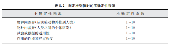 涉及一般人群的接觸劑量時,以動物實驗臨界效應(yīng)得出的犖犗犃犈犔或犅犕犇/犅犕犇犔通 常要除以不確定性系數(shù)100。這里還有兩個10倍系數(shù),其一是物種間差異,另一個是人群中 個體間差異(見表8.2)。另外的不確定性系數(shù)還可能來自數(shù)據(jù)資料的不足和有害作用的嚴(yán) 重性和不可逆性。