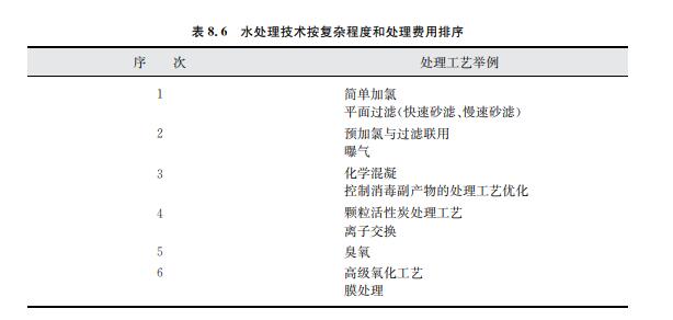 不同水處理工藝按其復(fù)雜程度和處理費(fèi)用的定性排序如表8.6所示,次序越高,工藝或 運(yùn)營越復(fù)雜。同時(shí),通常來說也意味著更高的處理費(fèi)用。