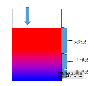 當(dāng)水流首先接觸的上層交換劑失效后,繼續(xù)進入的原水就與下一層交換劑進行離子交換,從而使工作層不斷下移。整個交換劑層便分為三個區(qū)域。隨著交換劑的運行,失效層的區(qū)域不斷增大,工作層不斷下移,未交換區(qū)域隨之減少。