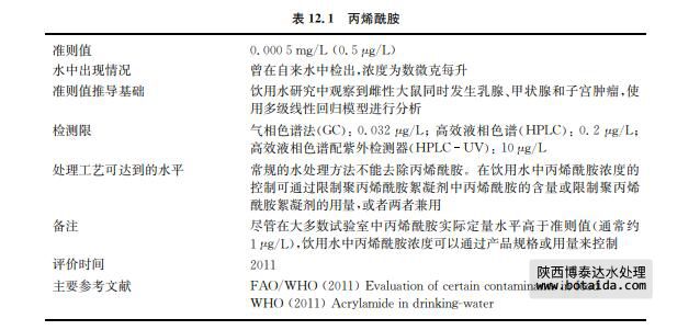 用聚丙烯酰胺絮凝劑處理飲用水時(shí)會(huì)造成丙烯酰胺單體的殘留(見表12.1)。通常,水 中該聚合物的最大允許用量為1mg/L。當(dāng)聚合物中單體的含量占0.05%時(shí),水中相對(duì)應(yīng)的單體最大的理論濃度相當(dāng)于0.5μg/L。實(shí)際使用中,濃度可能比上述還要低2~3倍。這個(gè) 濃度適用于陰離子和非離子聚丙烯酰胺,而陽離子聚丙烯酰胺中單體的殘留水平可能會(huì)高 些。聚丙烯酰胺還可以用作建造飲用水蓄水池和水井的灌漿劑。人對(duì)其的攝入源于食物的 可能性多于源于飲用水:由于食物加工過程使用聚丙烯酰胺,而高溫烹調(diào)食物(例如面包、 油炸的和烤的食物)可能生成丙烯酰胺單體。