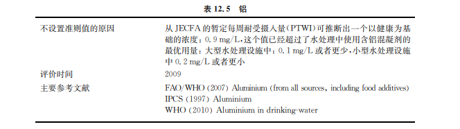 盡管鋁廣泛存在于食物、飲用水及抗酸劑中,很少有跡象表明經(jīng)口攝入鋁會引起人急性 中毒。有一種假設(shè)認為鋁的攝入會增加人類老年癡呆癥發(fā)病風(fēng)險。1997年 WHO發(fā)布的 環(huán)境健康標準中對鋁作出規(guī)定(見表12.5)。