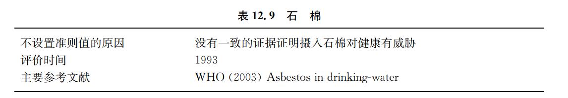 水中的石棉來自含石棉的材料和礦石在水中的分解,也來自工業(yè)排放物以及大氣污染 和供水系統(tǒng)中的石棉 水泥管道。石棉纖維從石棉 水泥管剝落可對(duì)水的供應(yīng)造成威脅。有 限的資料顯示,在淋浴或空氣潮濕時(shí),從自來水釋放到大氣的石棉暴露量可以忽略不計(jì)(見 表12.9)。