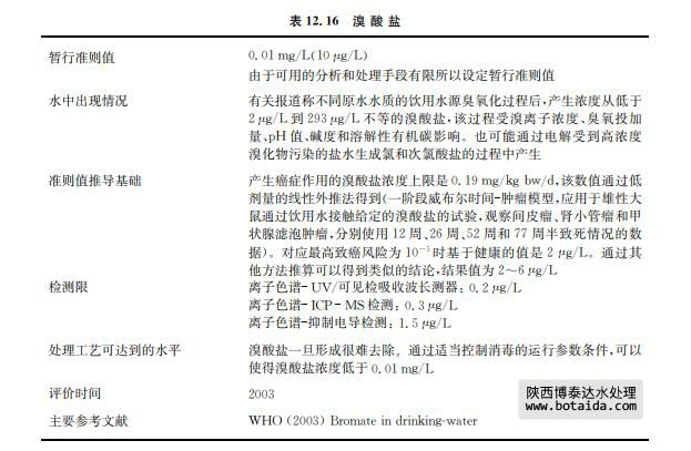 溴酸鈉和溴酸鉀是強(qiáng)氧化劑,主要用于燙發(fā)中和劑和硫化染料紡織品的染色。雖然 JECFA已經(jīng)做出規(guī)定(見表12.16),在食品加工中不宜使用溴酸鉀,它還是被用作氧化劑來對研磨中的面粉催熟,也用于啤酒制造處理大麥以及用于魚醬產(chǎn)品生產(chǎn)。溴酸鹽在水中通 常不存在,但可能存在于工業(yè)污染源中。有時來自于土壤污染。不過,其主要的來源是當(dāng)水 中含溴離子時,飲用水的臭氧化過程中形成溴酸鹽。電解含溴化物的鹽時,也可能在次氯酸 鹽溶液中生成溴酸鹽。