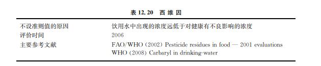 西維因(CASNo.63 25 2)是一種用于控制農(nóng)作物、樹木和觀賞植物害蟲的廣譜氨基 甲酸酯類殺蟲劑,它在公共衛(wèi)生和獸醫(yī)實(shí)踐中也有一些用途(見表12.20)。尚未有報(bào)道證明 飲用水中含有西維因,但它可能會(huì)經(jīng)滲流和噴灑進(jìn)入地表水。因此,除非在特殊情況下,通 過飲用水的接觸量是非常低的。普通人群中,攝入西維因的主要途徑是食物,但殘余量認(rèn)為 相對較低.