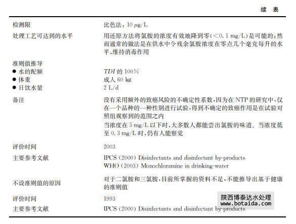 2)二氯胺和三氯胺 二氯胺和三氯胺沒有被廣泛研究,兩者現(xiàn)有的研究資料均不足以推導(dǎo)基于健康的準(zhǔn)則 值。不過,如果氯胺的含量沒有控制得當(dāng),這些化合物會(huì)造成水的味道與氣味問題(詳見第 10章)。