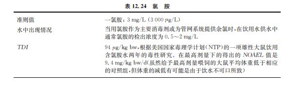 一氯胺、二氯胺和三氯胺是飲用水加氯消毒的副產(chǎn)物(見表12.24),在水中加入氯和氨 時(shí)可形成上述物質(zhì)。在飲用水管網(wǎng)系統(tǒng)中加入一氯胺可保持殘留的消毒活性。由于多氯胺 的形成不規(guī)律,而且相同濃度下一氯胺導(dǎo)致的味道和氣味問題較多氯胺嚴(yán)重,故只考慮設(shè)立 一氯胺基于健康的準(zhǔn)則值。氯胺在胃中受胃液作用迅速分解。使用氯胺代替氯消毒可減少 在飲用水供應(yīng)中三鹵甲烷的形成。不過,有研究顯示添加氯胺會(huì)形成其他副產(chǎn)品,如鹵代 酮、三氯硝基甲烷、氯化氰、鹵乙酸、鹵代乙腈、醛類及氯酚。一氯胺是氯胺的主要成分,公認(rèn) 消毒效果比自由氯差,常在二次消毒中用來保持管網(wǎng)系統(tǒng)的余氯。