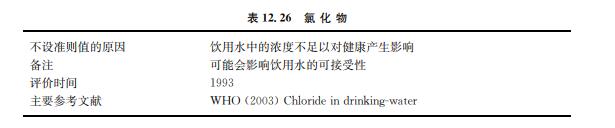 飲用水中的氯化物(見(jiàn)表12.26)主要有天然來(lái)源、污水排放和工業(yè)污染物、含有防凍鹽 的城市地表徑流和咸水侵蝕。 人對(duì)氯化物的主要暴露來(lái)自添加至食物中的鹽,并且從食物中攝入的氯化物遠(yuǎn)比從飲 水中取得多。