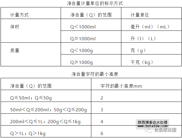 凈含量應(yīng)依據(jù)法定計(jì)量單位標(biāo)注,分別質(zhì)量單位[克(g)、千克(kg)]和體積單位[升(l)(L)、毫升(ml)(mL)]。固態(tài)食品只能標(biāo)示質(zhì)量單位,液態(tài)、半固態(tài)黏性食品可以選擇標(biāo)示體積單位或質(zhì)量單位。