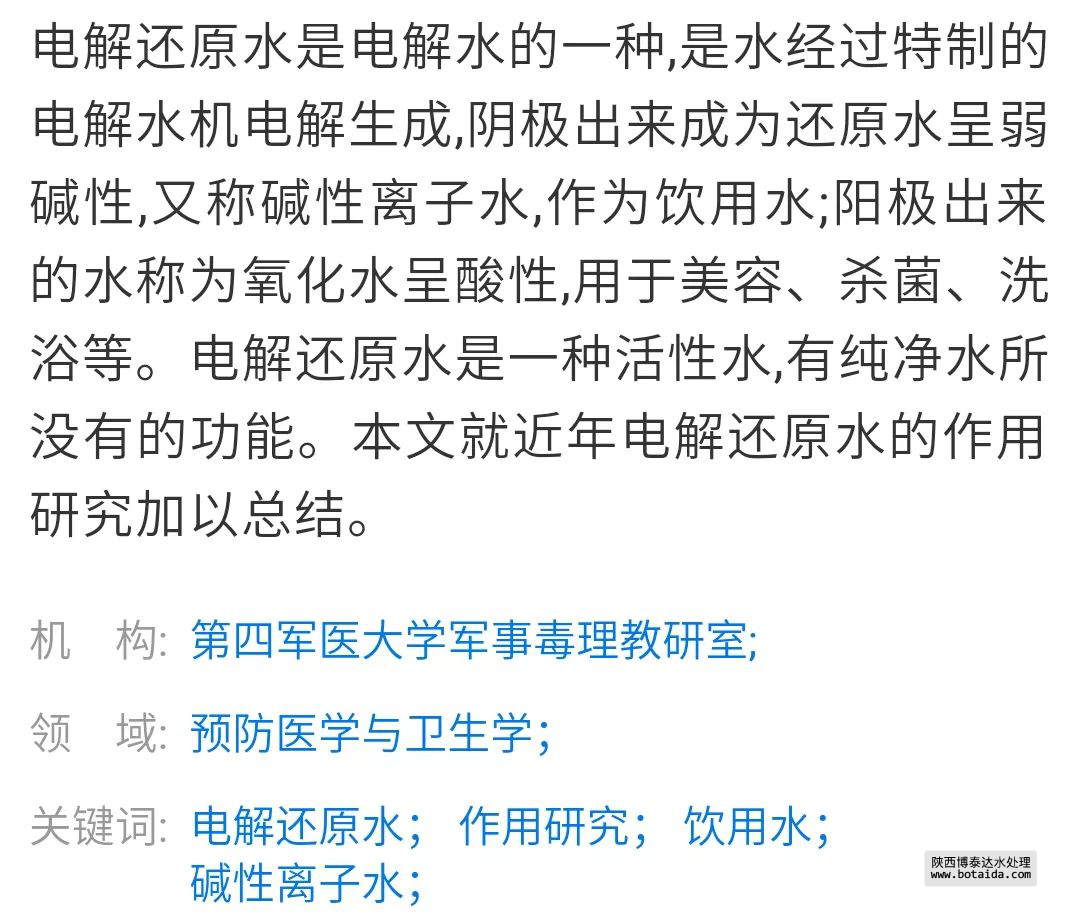 通常情況下,電解還原水是由普通的自來凈化水,然后通過陰陽電極,在電場的作用下將水分子團打散、變小、重新排列,使水分子的結(jié)構(gòu)發(fā)生改變,使其中一部分水的氧化還原電位呈正值,另一部分水的氧化還原電位呈負值,最后通過膜分離技術(shù)得到電解還原水,使之具有醫(yī)療保健作用.