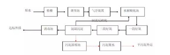 水處理系統(tǒng)由調(diào)節(jié)池、缺氧池、好氧池(接觸氧化池)、二沉池組成。來(lái)自生產(chǎn)車(chē)間的污水自流入調(diào)節(jié)池,調(diào)節(jié)池入口設(shè)機(jī)械格柵,以攔截大顆粒狀和纖維狀雜質(zhì),在調(diào)節(jié)池中污水充分地混合,調(diào)節(jié)水量并初步降解有機(jī)物,然后通過(guò)污水泵將污水輸入氣浮池,去除油污,懸浮物進(jìn)入缺氧池,在缺氧池中回流混合液與原污水充分混合,通過(guò)兼氧微生物的作用,將亞硝酸氮和硝酸氮轉(zhuǎn)化為氮?dú)猓瓿煞聪趸摰?,缺氧池出水自流入接觸氧化池。接觸氧化池是一種以生物膜法為主,兼有活性污泥法的生物處理裝置,通過(guò)鼓風(fēng)機(jī)提供氧源,使污水中的有機(jī)物與池內(nèi)生物膜充分接觸,經(jīng)微生物吸附、降解作用,使水質(zhì)得到凈化。二沉池出水進(jìn)入混凝沉淀,進(jìn)一步去除污染物,使出水達(dá)標(biāo)排放。