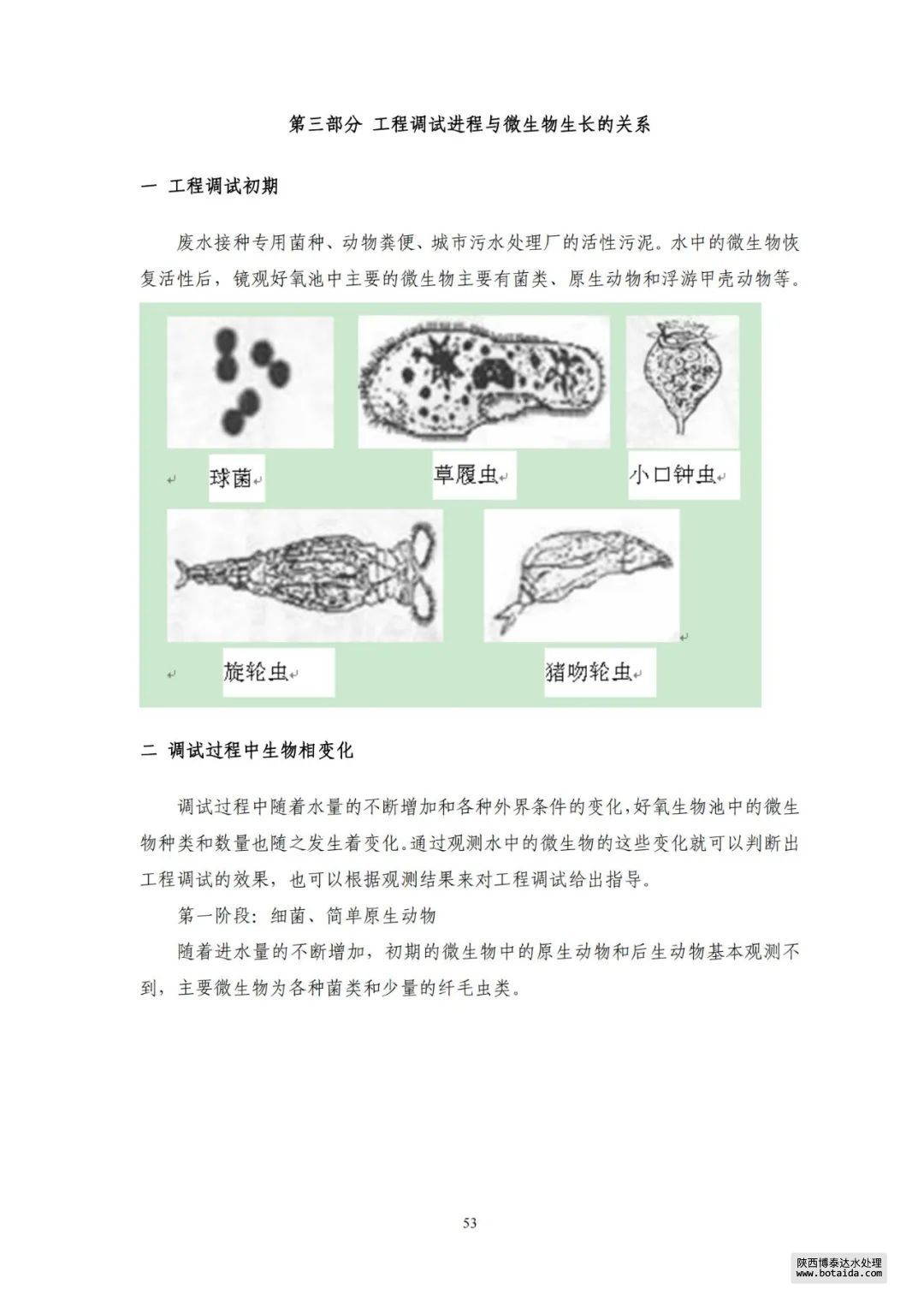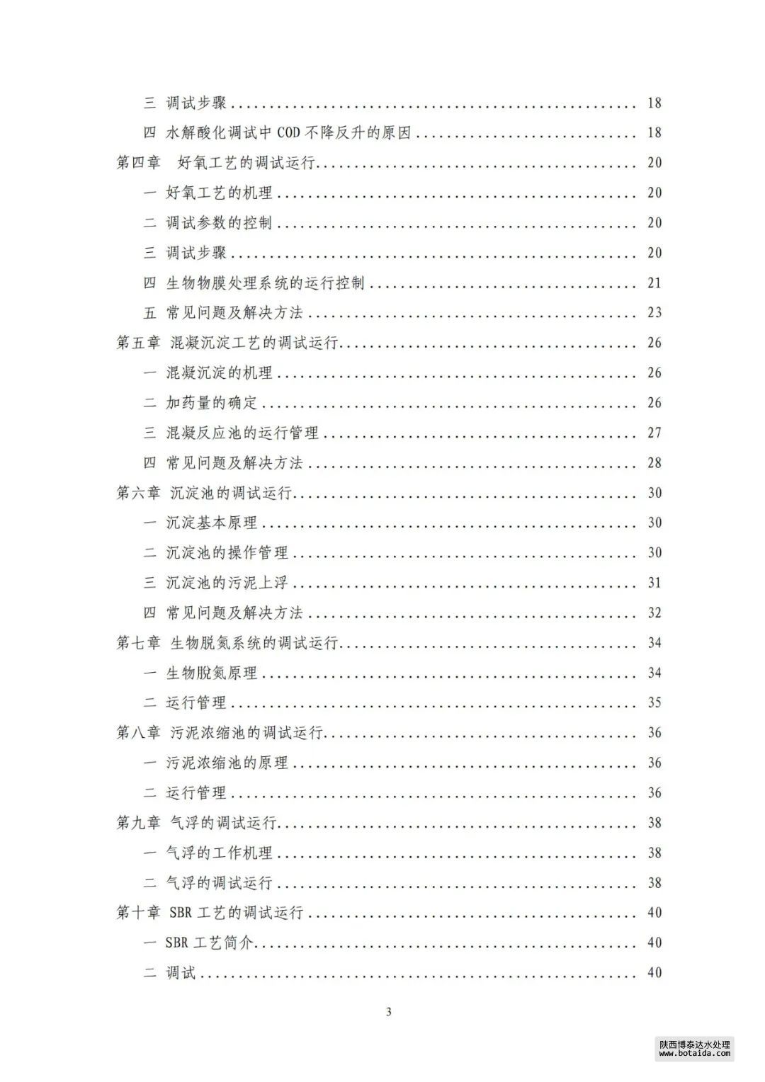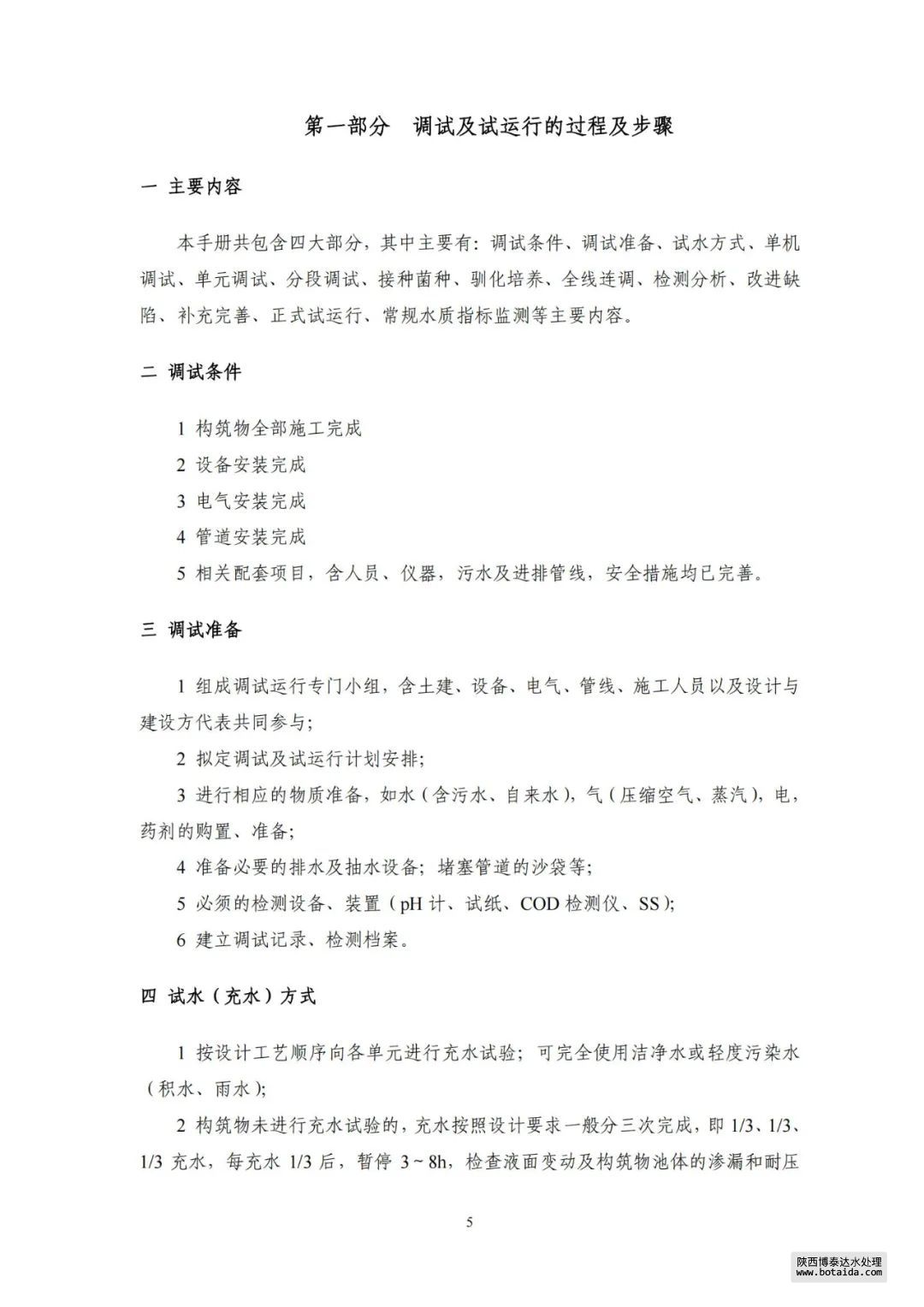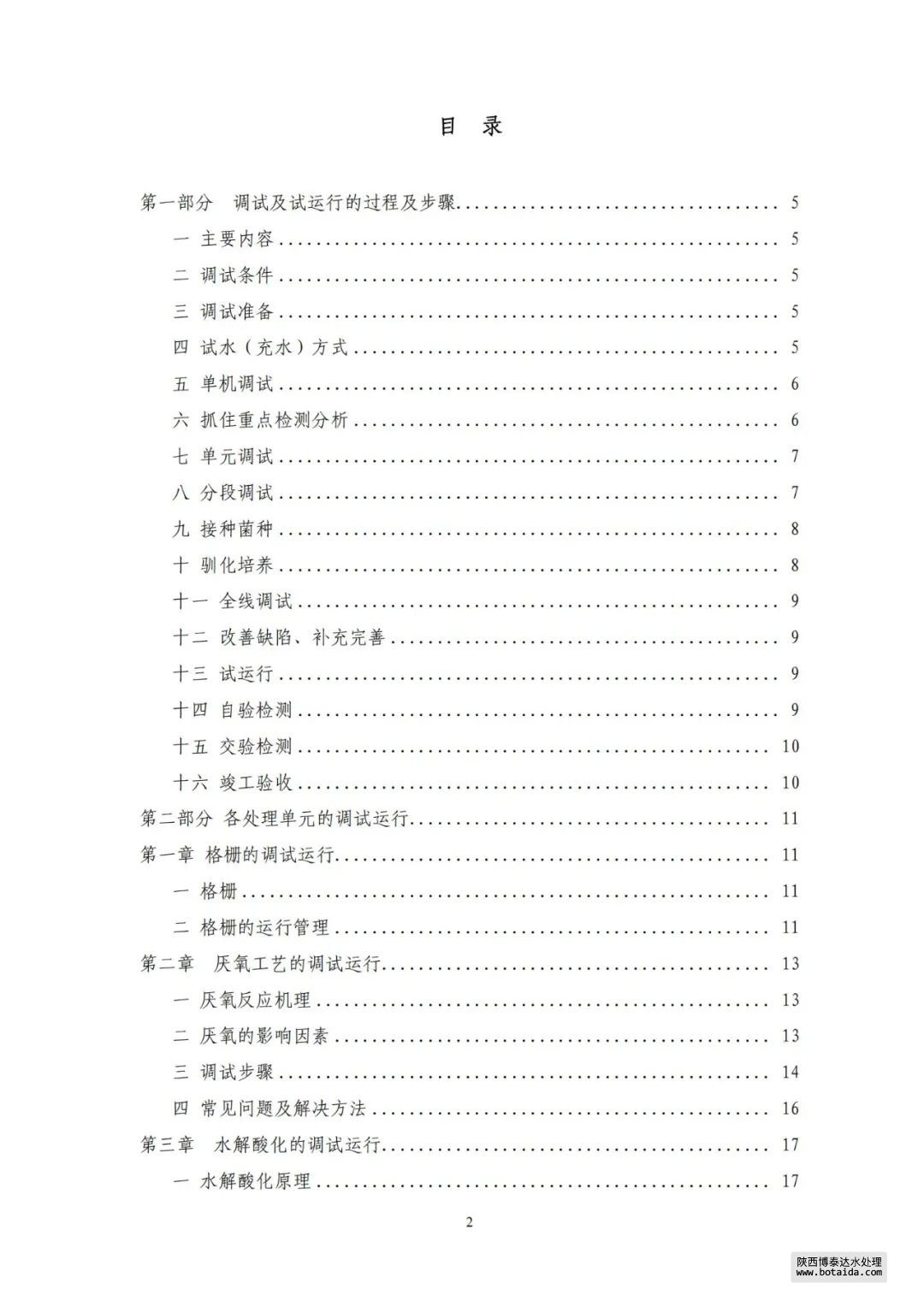 本手冊共包含四大部分,其中主要有:調試條件、調試準備、試水方式、單機調試、單元調試、分段調試、接種菌種、馴化培養(yǎng)、全線連調、檢