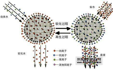 當(dāng)樹脂吸收一定量的鈣鎂離子之后,就必須進行再生,再生過程就是用鹽箱中的食鹽水沖洗樹脂層,把樹脂上的硬度離子在置換出來,隨再生廢液排出罐外,樹脂就又恢復(fù)了軟化交換功能。
